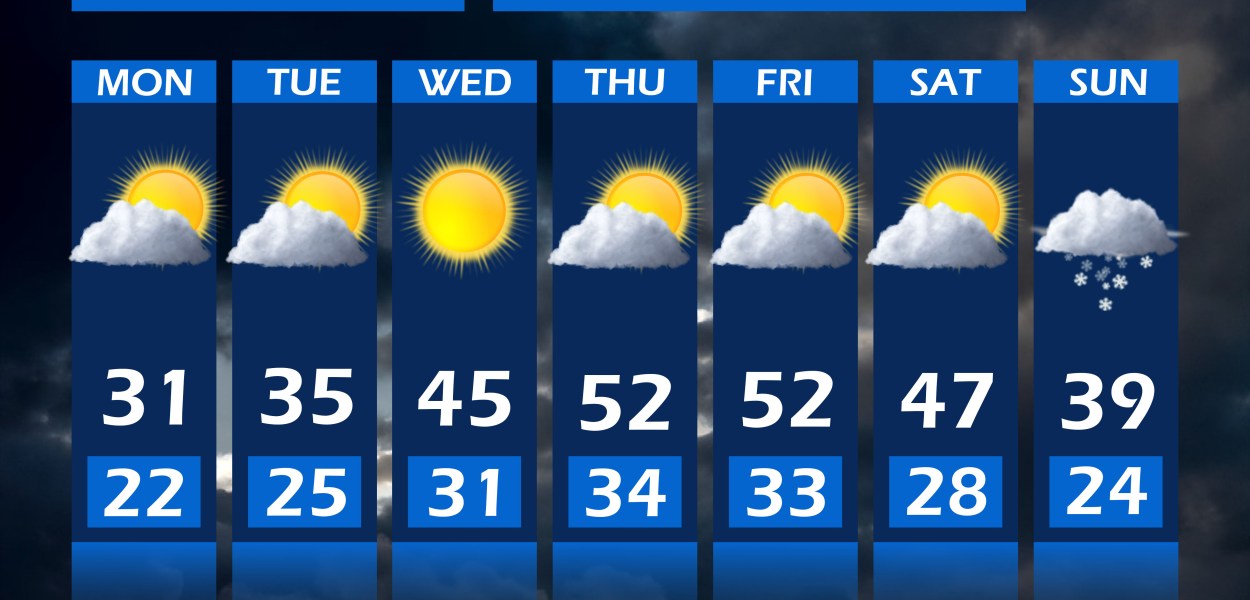 BY NICOLE DAVIS Monday: Partly cloudy with cooler temperatures. Highs around freezing and lows in the lower 20s. Tuesday: Sunny with passing clouds throughout the day. Highs in the mid 30s and lows in the mid 20s. Wednesday: Mostly sunny, cloud cover increasing towards nightfall. Highs in the mid […]